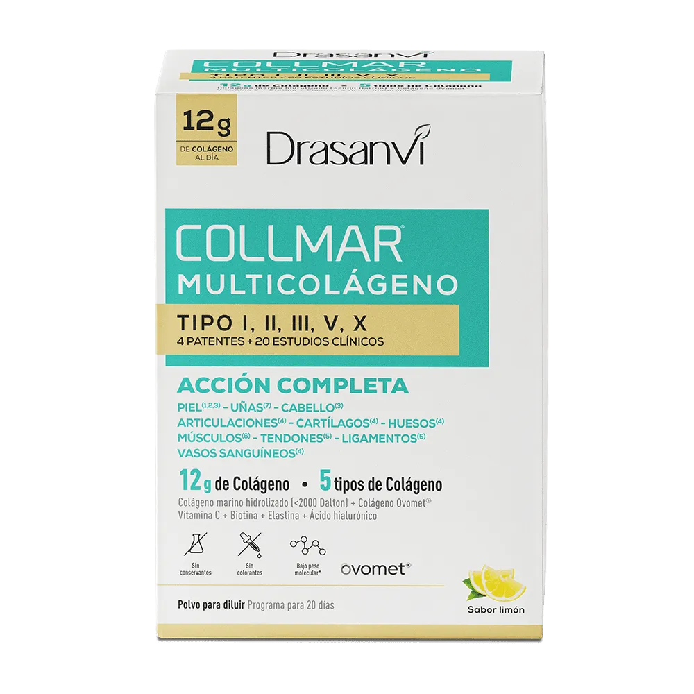 Colágeno Marino Hidrolizado Tipo I(Contiene PESCADO), Aroma(Aroma limón), Ovomet® – Membrana de cáscara de huevo (Contiene HUEVO), Colágeno Marino hidrolizado Tipo III(Contiene PESCADO), Extracto seco de acerola(Fruto) (Malpighia punicifolia, Vitamina C al 25%), Colágeno Marino Hidrolizado Tipo II(Contiene PESCADO), Extracto seco Bambú(Tallo) (Bambusa arundinaea, 75% silicio), Edulcorante(Sucralosa), Gluconato de cobre(Cobre 14%) , Biotina.