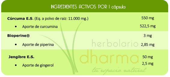 Cúrcuma granular (E.S. 20:1, titulado a ≥ 95% en curcumina), jengibre (E.S., titulado a ≥ 5% en gingerol), agente de carga (celulosa microcristalina), pimienta negra Bioperine® (E.S. 50:1, titulado a ≥ 95% en piperina), antiaglomerantes (estearato de magnesio, dióxido de silicio). Cubierta: agua, hidroxipropilmetilcelulosa.
