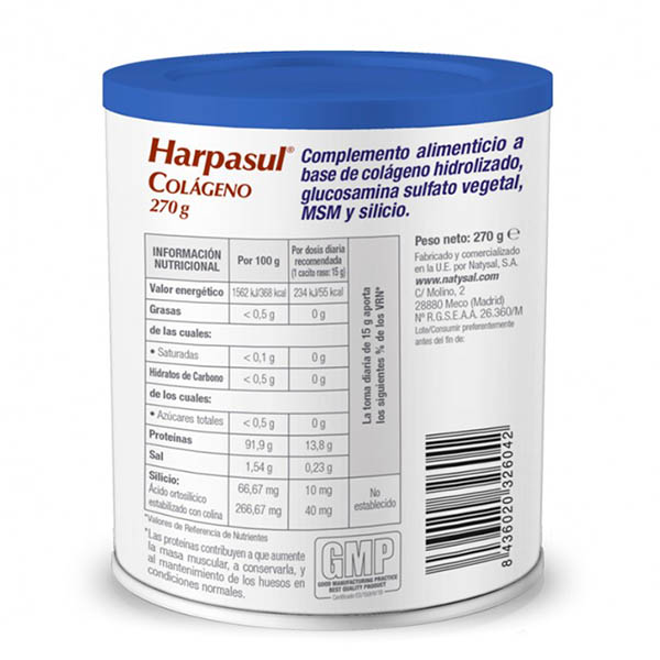 Colágeno hidrolizado, sulfato de glucosamina (origen crustáceos), Metil Sulfonil Metano (MSM), aroma de vainilla, ácido ortosilícico estabilizado con colina.